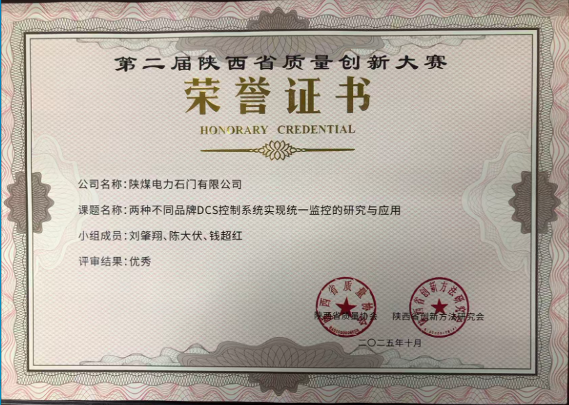 陜煤石電:《兩種不同品牌DCS控制系統(tǒng)實現(xiàn)統(tǒng)一監(jiān)控的研究與應用》獲陜西省質量創(chuàng)新大賽優(yōu)秀獎
